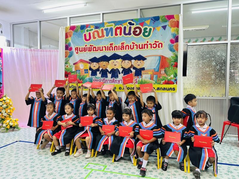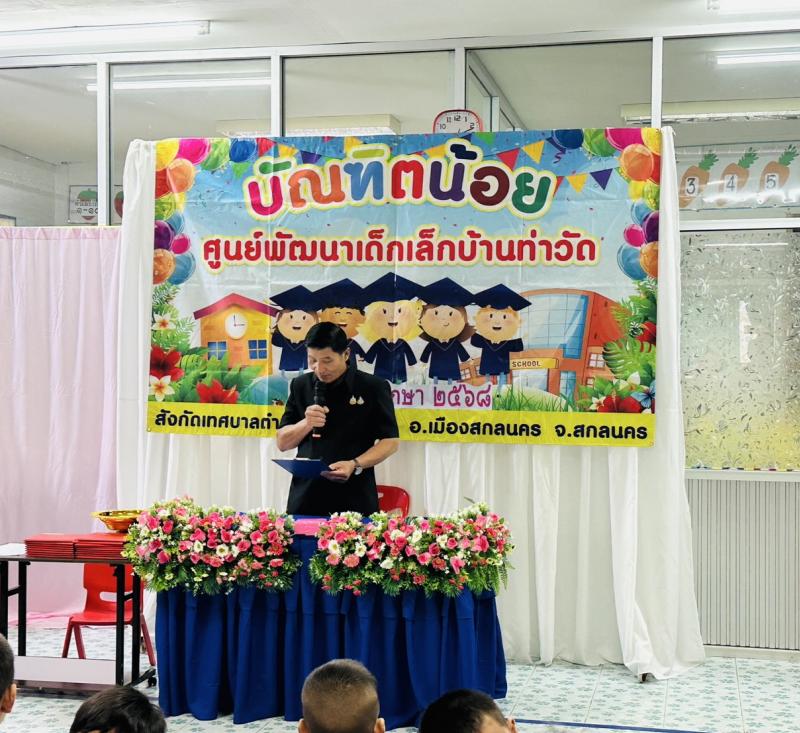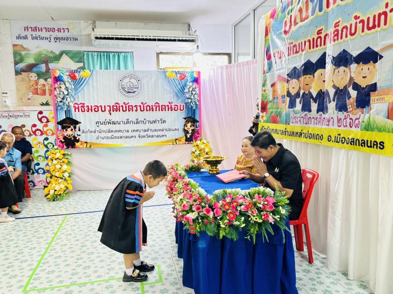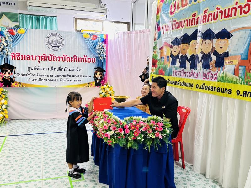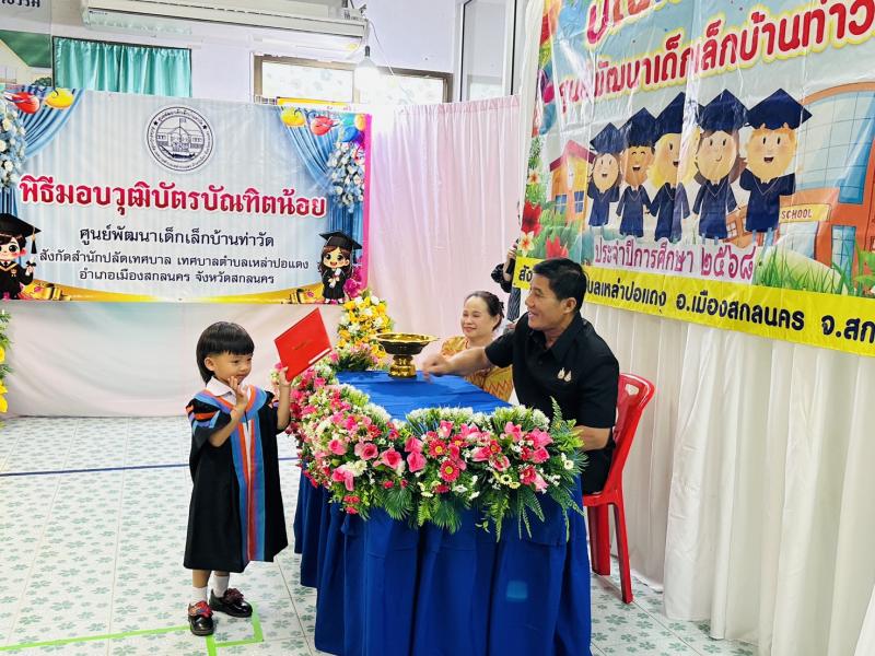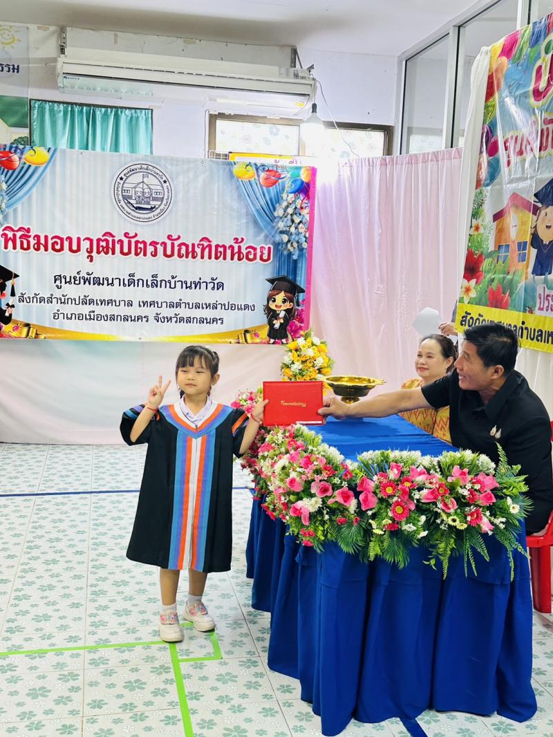 นายลำไพ งิ้วพรม นายกเทศมนตรีตำบลเหล่าปอแดง พร้อมคณะผู้บริหาร และสมาชิกสภาฯ เป็นประธาน มอบวุฒิบัตร บัณฑิตน้อย ประจำปีการศึกษา 2569 ร่วมกับคณะครู ผู้ปกครอง ณ ศูนย์พัฒนาเด็กเล็กบ้านท่าวัด ตำบลเหล่าปอแดง อำเภอเมือง จังหวัดสกลนคร