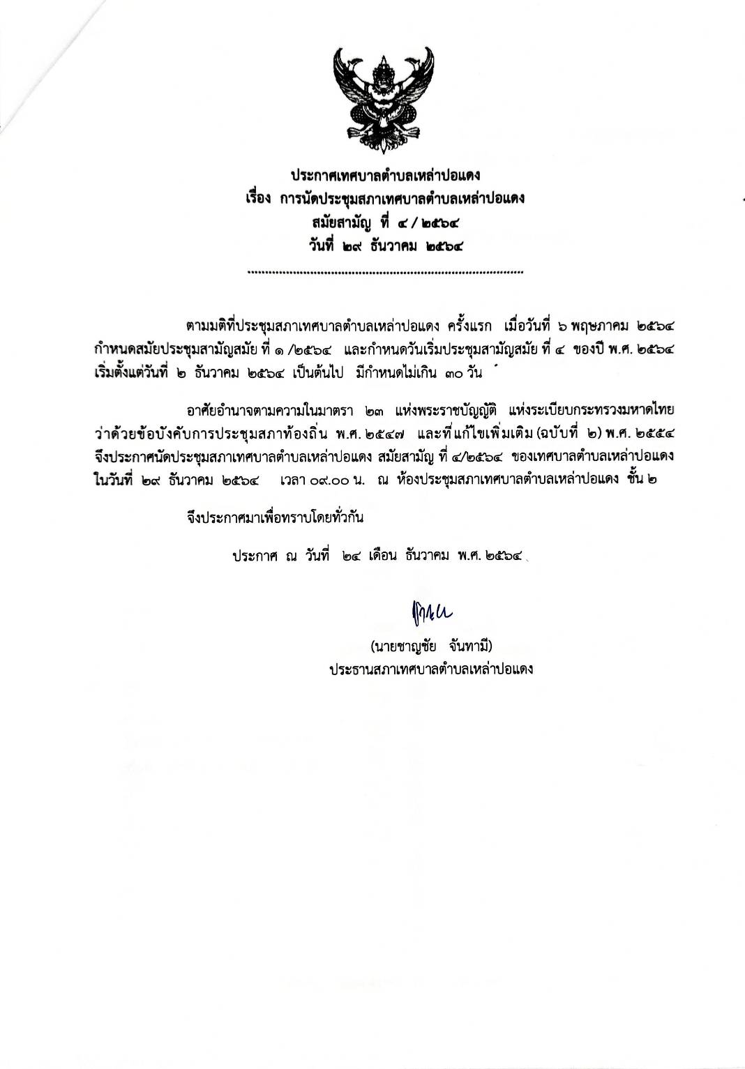 ประกาศ เรื่อง การนัดประชุมสภาเทศบาลตำบลเหล่าปอแดง สมัยสามัญ ที่ 4/2564
