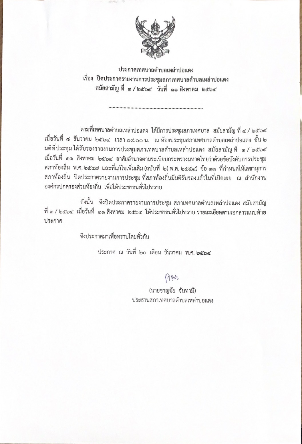 ประกาศ เรื่อง ปิดประกาศรายงานการประชุมสภาเทศบาลตำบลเหล่าปอแดง สมัยสามัญ ที่3/2564
