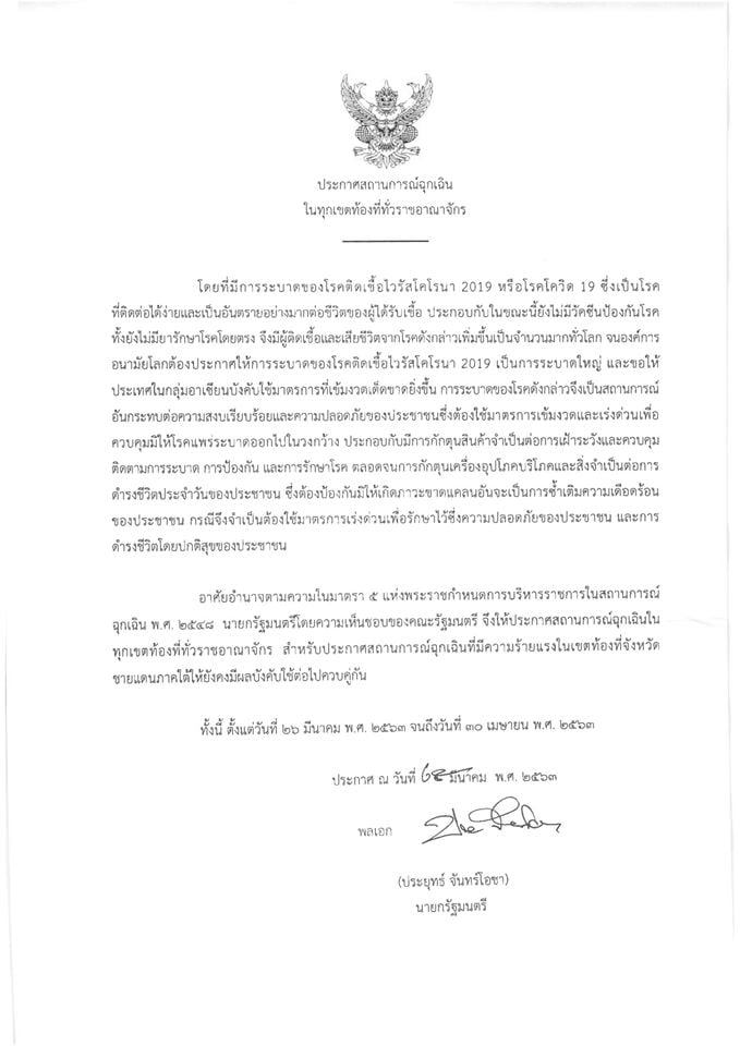 ประกาศสถานการณ์ฉุกเฉิน ในทุกเขตท้องที่ทั่วราชอาณาจักร