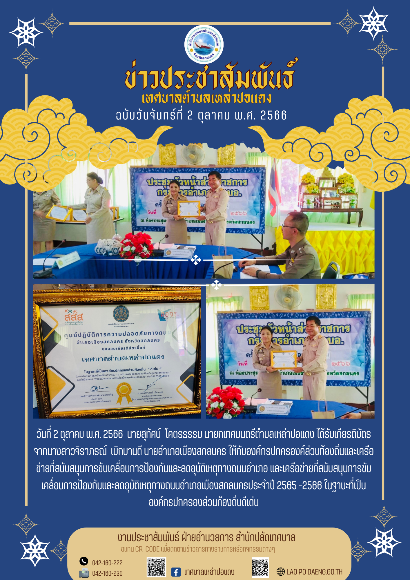 ประชาสัมพันธ์ ได้รับเกียรติบัตร ให้กับองค์กรปกครองค์ส่วนท้องถิ่นและเครือข่ายที่สนับสนุนการขับเคลื่อนการป้องกันและลดอุบัติเหตุทางถนนอำเภอเมืองสกลนครประจำปี 2565 -2566 ในฐานะที่เป็นองค์กรปกครองส่วนท้องถิ่นดีเด่น