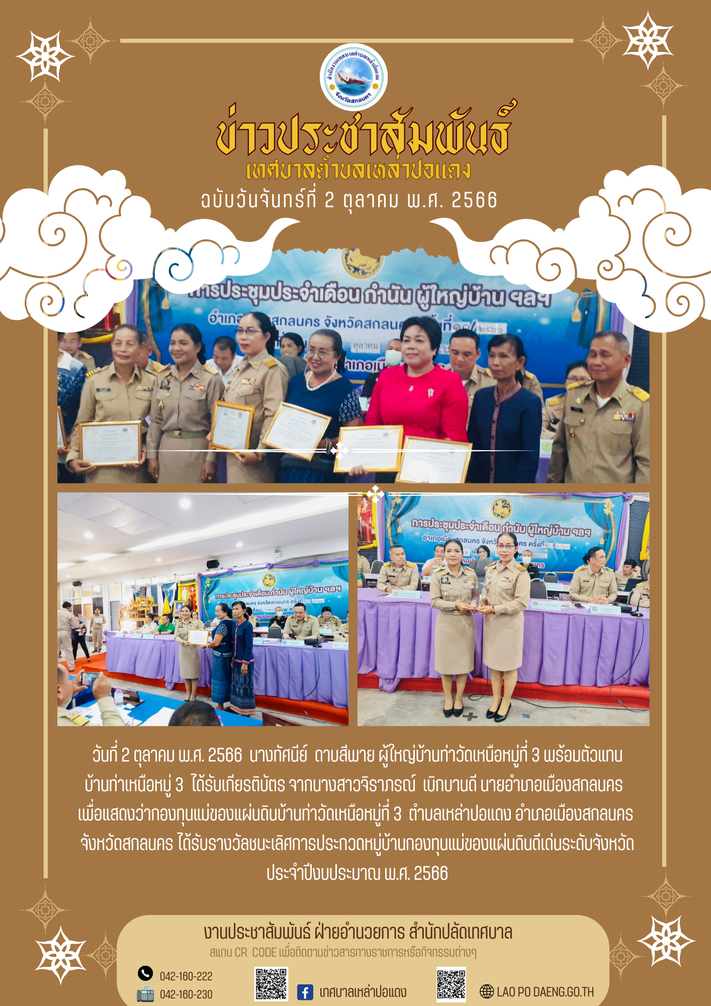 นางทัศนีย์ ดาบสีพาย ผู้ใหญ่บ้านท่าวัดเหนือหมู่ที่ 3 พร้อมตัวแทน บ้านท่าเหนือหมู่ 3 ได้รับเกียรติบัตร จากนางสาวจิราภรณ์ เบิกบานดี นายอำเภอเมืองสกลนคร เพื่อแสดงว่ากองทุนแม่ของแผ่นดินบ้านท่าวัดเหนือหมู่ที่ 3 ตำบลเหล่าปอแดง อำเภอเมืองสกลนคร จังหวัดสกลนคร ได้รับรางวัลชนะเลิศการประกวดหมู่บ้านกองทุนแม่ของแผ่นดินดีเด่นระดับจังหวัดประจำปีงบประมาณ พ.ศ. 2566