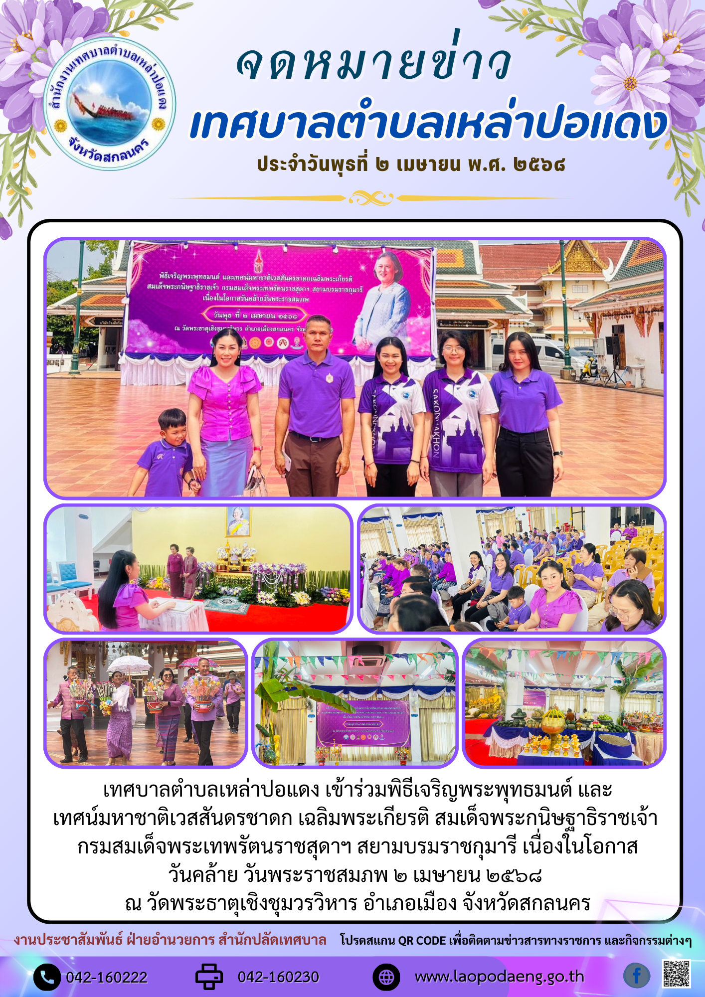ประชาสัมพันธ์ เทศบาลตำบลเหล่าปอแดง เข้าร่วมพิธีเจริญพระพุทธมนต์ และเทศน์มหาชาติเวสสันดรชาดก เนื่องในโอกาสวันคล้าย วันพระราชสมภพ ๒ เมษายน ๒๕๖๘