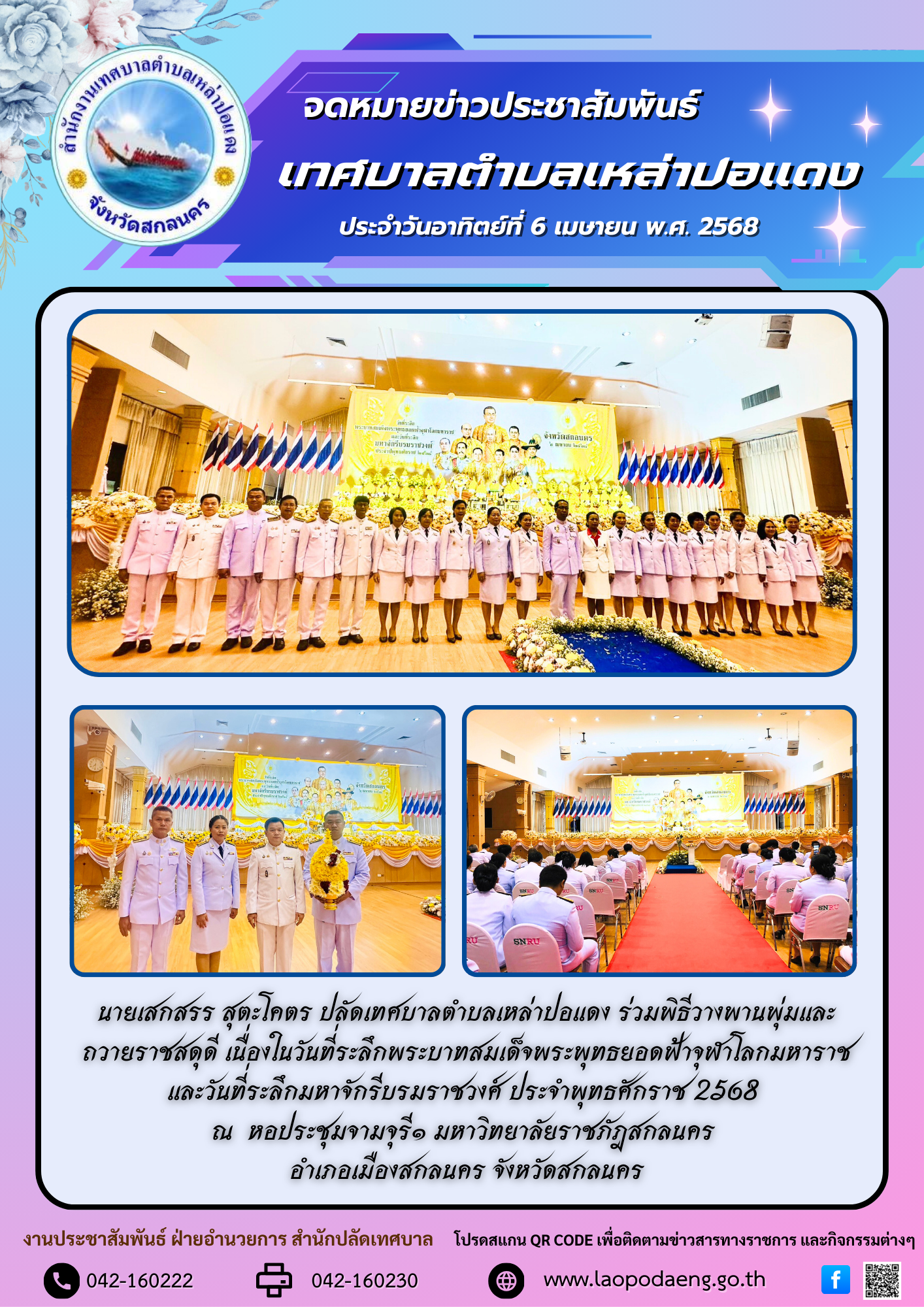 ประชาสัมพันธ์ นายเสกสรร สุตะโคตร ปลัดเทศบาลตำบลเหล่าปอแดง ร่วมพิธีวางพานพุ่มและถวายราชสดุดี เนื่องในวันที่ระลึกพระบาทสมเด็จพระพุทธยอดฟ้าจุฬาโลกมหาราช ณ หอประชุมจามจุรี๑ มหาวิทยาลัยราชภัฎสกลนคร