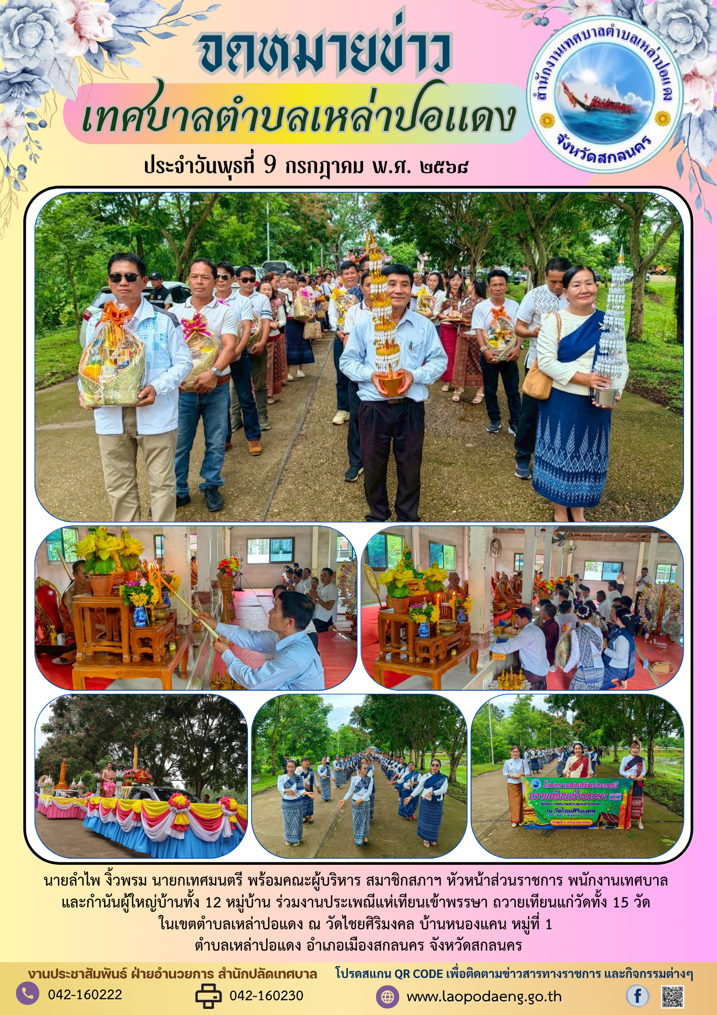 ประชาสัมพันธ์ นายลำไพ งิ้วพรม นายกเทศมนตรี พร้อมคณะผู้บริหาร สมาชิกสภาฯ หัวหน้าส่วนราชการ พนักงานเทศบาล และกำนันผู้ใหญ่บ้านทั้ง 12 หมู่บ้าน ร่วมงานประเพณีแห่เทียนเข้าพรรษา ณ วัดไชยศิริมงคล บ้านหนองแคน หมู่ที่ 1