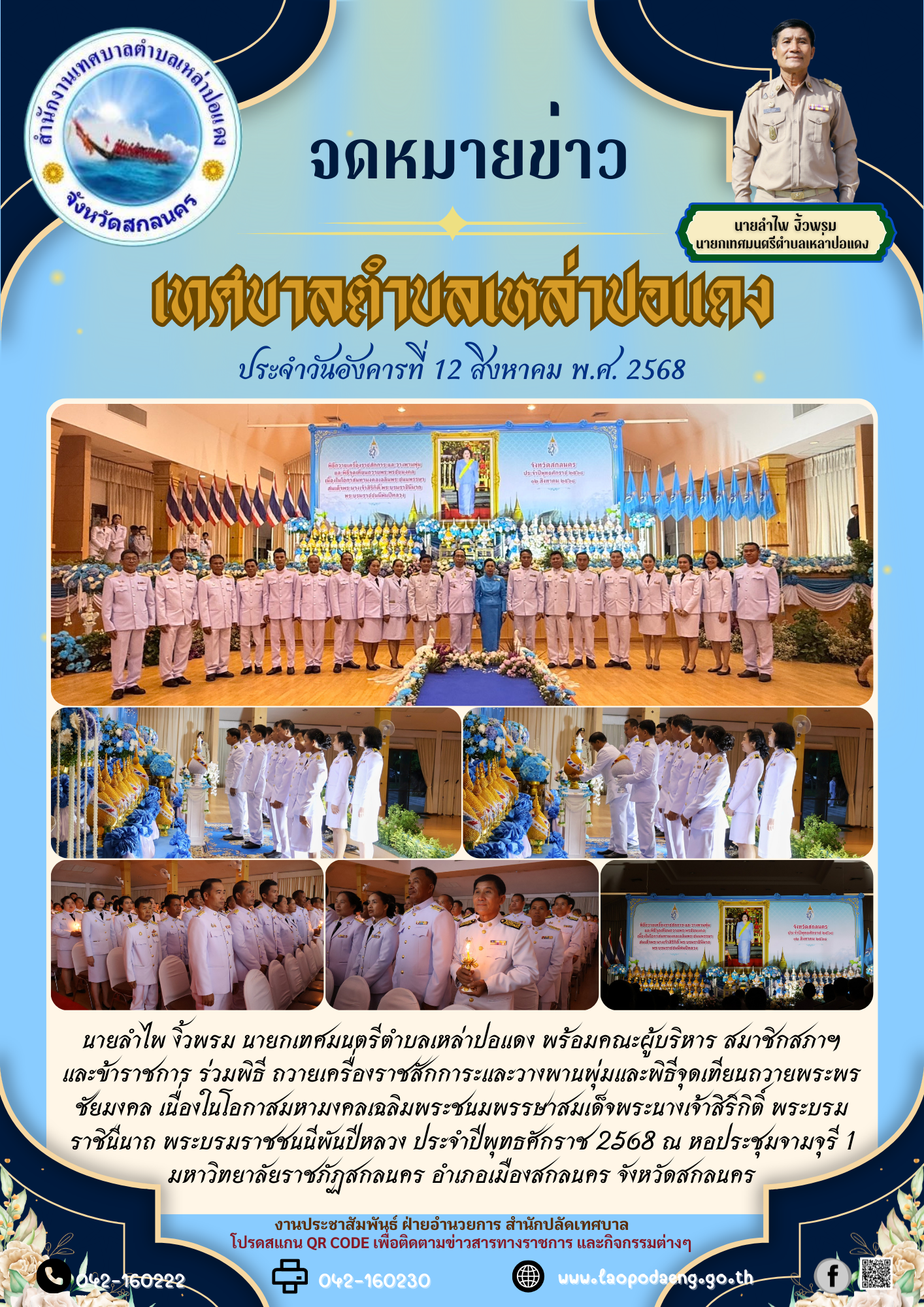 ประชาสัมพันธ์ นายลำไพ งิ้วพรม นายกเทศมนตรีตำบลเหล่าปอแดง พร้อมคณะผู้บริหาร สมาชิกสภาฯและข้าราชการ ร่วมพิธี ถวายเครื่องราชสักการะและวางพานพุ่มและพิธีจุดเทียนถวายพระพรชัยมงคล ณ มหาวิทยาลัยราชภัฏสกลนคร อำเภอเมืองสกลนคร จังหวัดสกลนคร