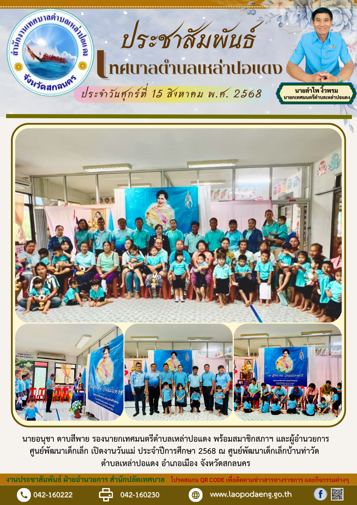 ประชาสัมพันธ์ นายอนุชา ดาบสีพาย รองนายกเทศมนตรีตำบลเหล่าปอแดง พร้อมสมาชิกสภาฯ เปิดงานวันแม่ ประจำปีการศึกษา 2568 ณ ศูนย์พัฒนาเด็กเล็กบ้านท่าวัด อำเภอเมือง จังหวัดสกลนคร