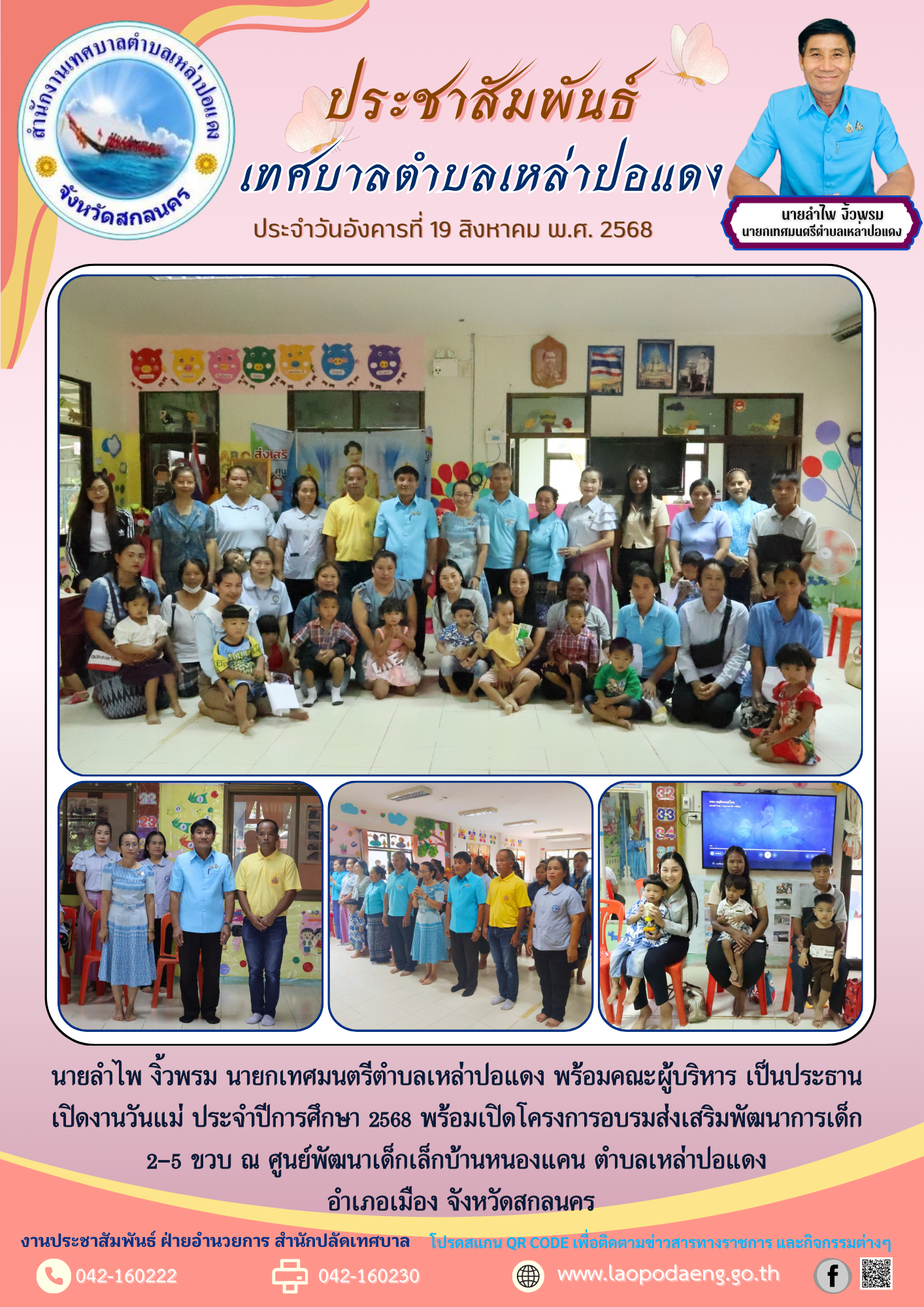 ประชาสัมพันธ์ นายลำไพ งิ้วพรม นายกเทศมนตรีตำบลเหล่าปอแดง เป็นประธาน เปิดงานวันแม่ ประจำปีการศึกษา 2568 พร้อมเปิดโครงการอบรมส่งเสริมพัฒนาการเด็ก ณ ศูนย์พัฒนาเด็กเล็กบ้านหนองแคน อำเภอเมือง จังหวัดสกลนคร