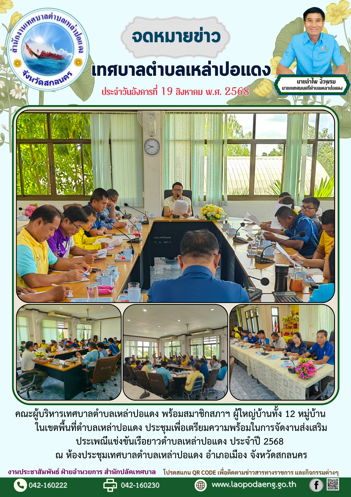 ประชาสัมพันธ์ คณะผู้บริหารเทศบาลตำบลเหล่าปอแดง พร้อมสมาชิกสภาฯ ผู้ใหญ่บ้านทั้ง 12 หมู่บ้าน ในเขตพื้นที่ ประชุมเพื่อเตรียมความพร้อมในการจัดงานส่งเสริมประเพณีแข่งขันเรือยาว ณ ห้องประชุมเทศบาลตำบลเหล่าปอแดง อำเภอเมือง จังหวัดสกลนคร