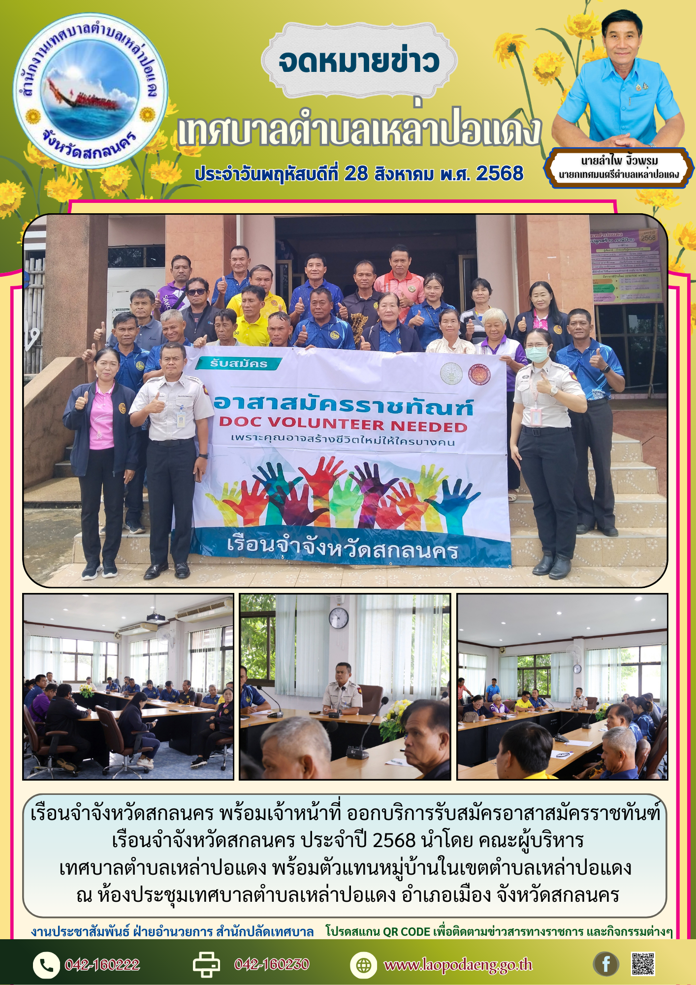 ประชาสัมพันธ์ เรือนจำจังหวัดสกลนคร ออกบริการรับสมัครอาสาสมัครราชทันฑ์ ประจำปี 2568 ณ ห้องประชุมเทศบาลตำบลเหล่าปอแดง อำเภอเมือง จังหวัดสกลนคร