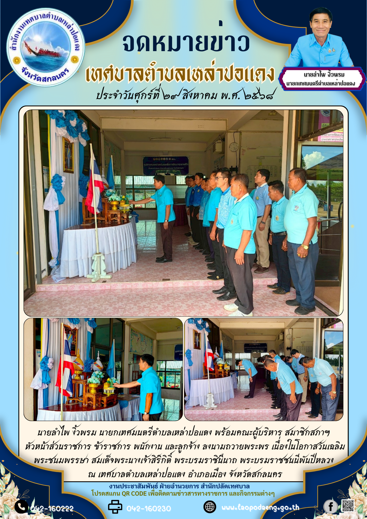 ประชาสัมพันธ์ นายลำไพ งิ้วพรม นายกเทศมนตรีตำบลเหล่าปอแดง พร้อมคณะผู้บริหาร ลงนามถวายพระพร เนื่องในโอกาสวันเฉลิมพระชนมพรรษา สมเด็จพระนางเจ้าสิริกิติ์ พระบรมราชินีนาถ พระบรมราชชนนีพันปีหลวง ณ เทศบาลตำบลเหล่าปอแดง อำเภอเมือง จังหวัดสกลนคร