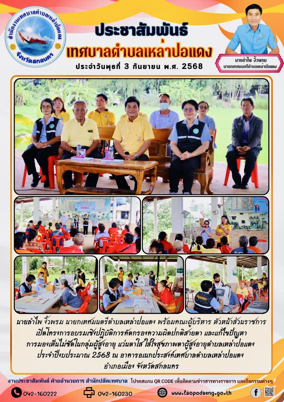 ประชาสัมพันธ์ นายลำไพ งิ้วพรม นายกเทศมนตรีตำบลเหล่าปอแดง เปิดโครงการอบรมเชิงปฎิบัติการคัดกรองความผิดปกติสายตา กลุ่มผู้สูงอายุ ประจำปีงบประมาณ 2568 ณ อาคารอเนกประสงค์เทศบาลตำบลเหล่าปอแดง อำเภอเมือง จังหวัดสกลนคร