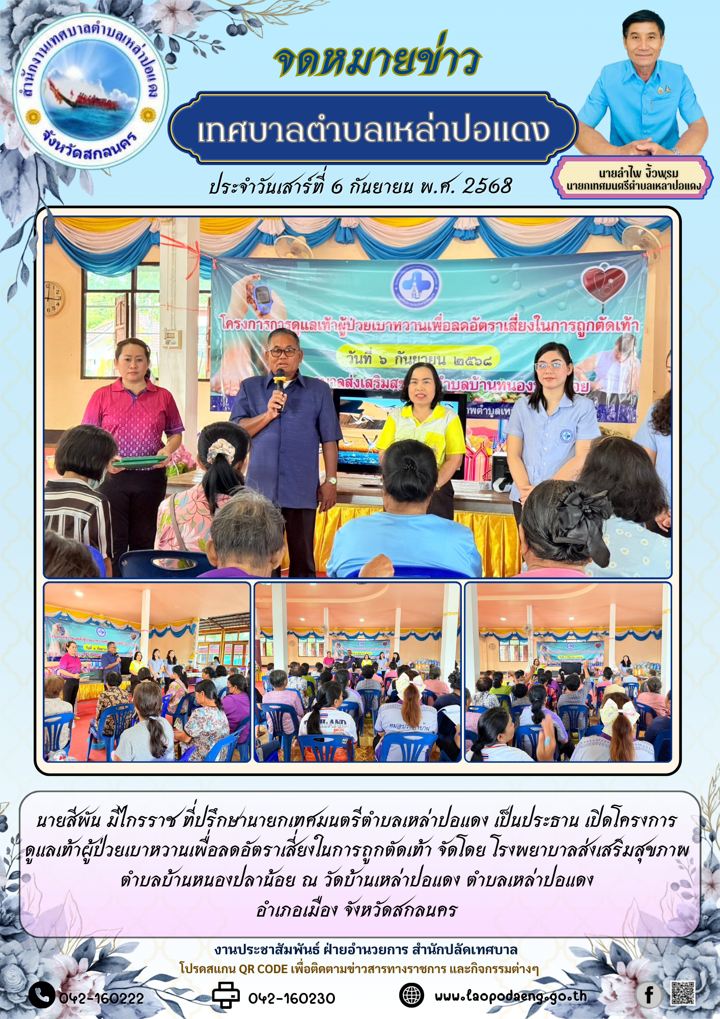 ประชาสัมพันธ์ นายสีพัน มีไกรราช ที่ปรึกษานายกเทศมนตรีตำบลเหล่าปอแดง เปิดโครงการดูแลเท้าผู้ป่วยเบาหวานเพื่อลดอัตราเสี่ยงในการถูกตัดเท้า ณ วัดบ้านเหล่าปอแดง ตำบลเหล่าปอแดง อำเภอเมือง จังหวัดสกลนคร