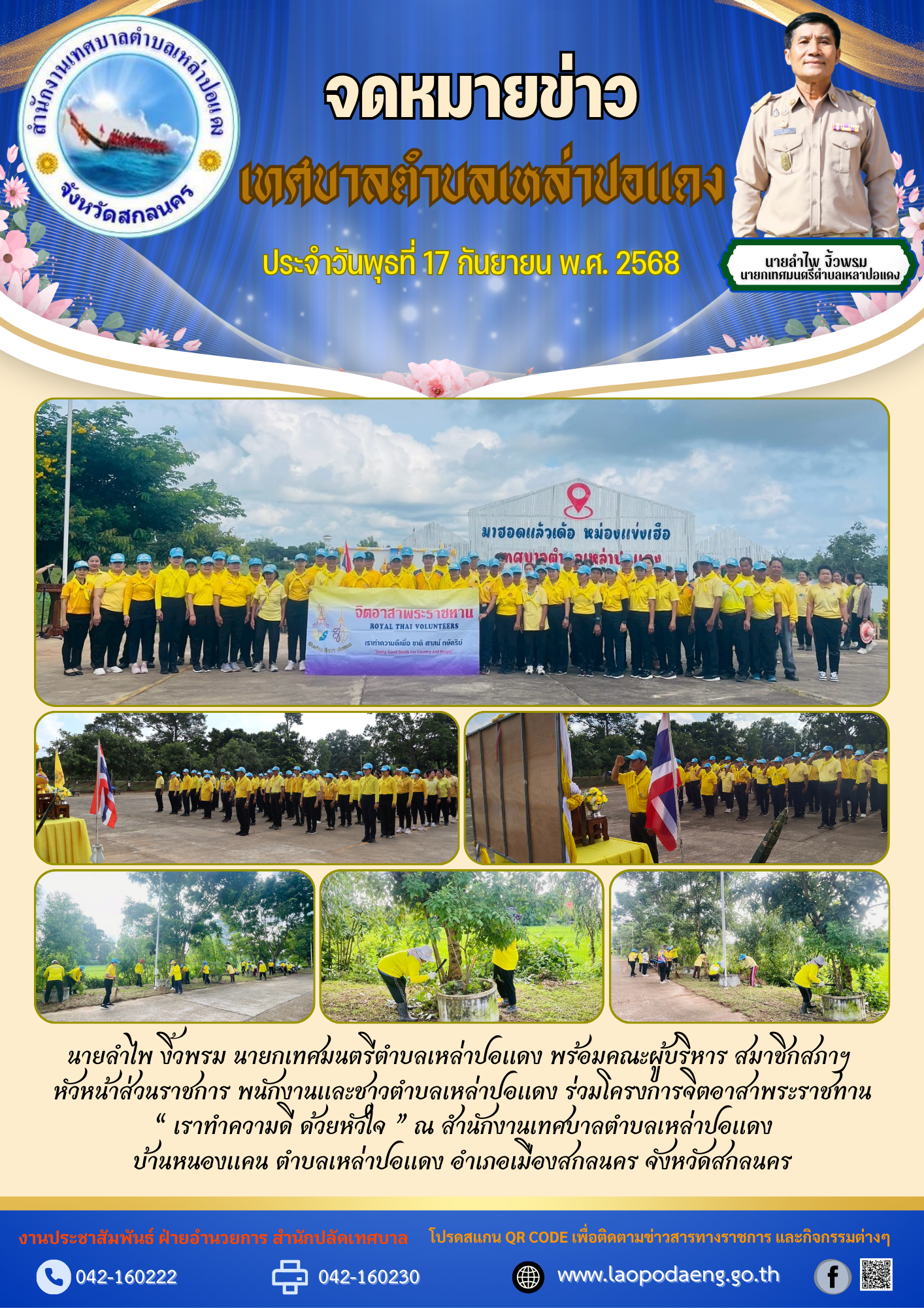 ประชาสัมพันธ์ นายลำไพ งิ้วพรม นายกเทศมนตรีตำบลเหล่าปอแดง พร้อมคณะผู้บริหาร ร่วมโครงการจิตอาสาพระราชทาน “เราทำความดี ด้วยหัวใจ” ณ สำนักงานเทศบาลตำบลเหล่าปอแดง
