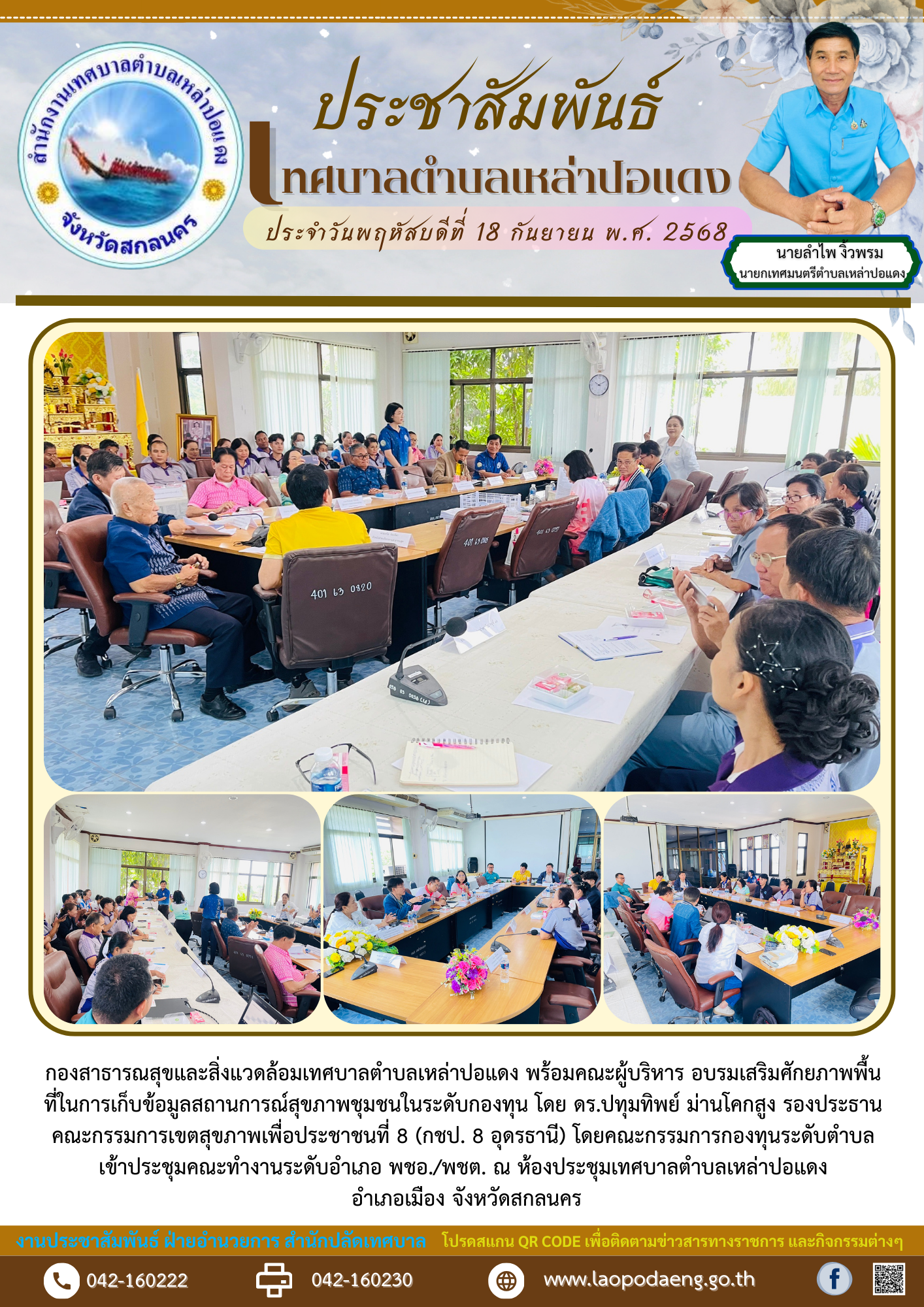ประชาสัมพันธ์ กองสาธารณสุขและสิ่งแวดล้อมเทศบาลตำบลเหล่าปอแดง พร้อมคณะผู้บริหาร อบรมเสริมศักยภาพพื้น ที่ในการเก็บข้อมูลสถานการณ์สุขภาพชุมชนในระดับกองทุน ณ ห้องประชุมเทศบาลตำบลเหล่าปอแดง