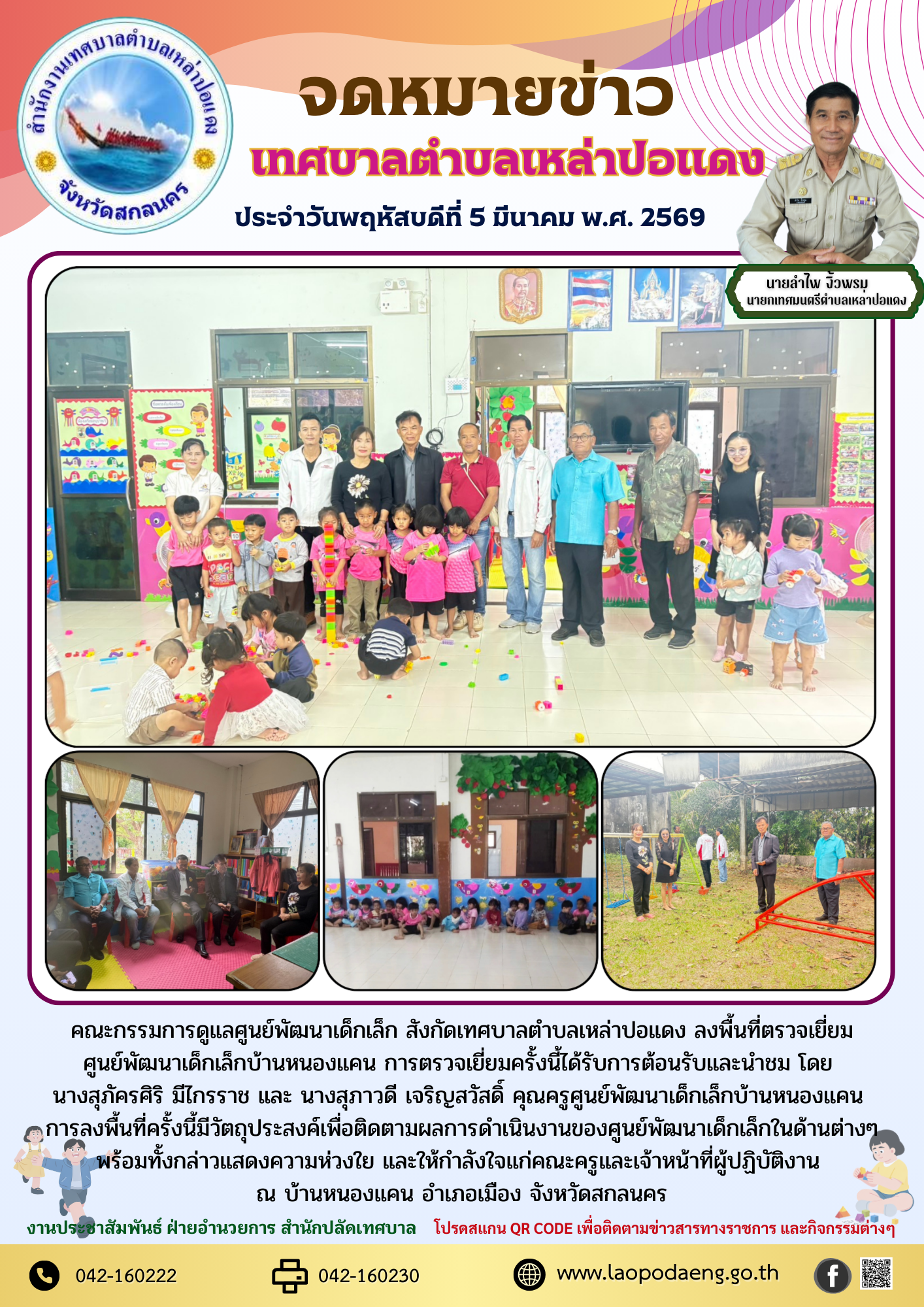 ประชาสัมพันธ์ คณะกรรมการดูแลศูนย์พัฒนาเด็กเล็ก สังกัดเทศบาลตำบลเหล่าปอแดง ลงพื้นที่ตรวจเยี่ยมศูนย์พัฒนาเด็กเล็กบ้านหนองแคน ณ บ้านหนองแคน อำเภอเมือง จังหวัดสกลนคร