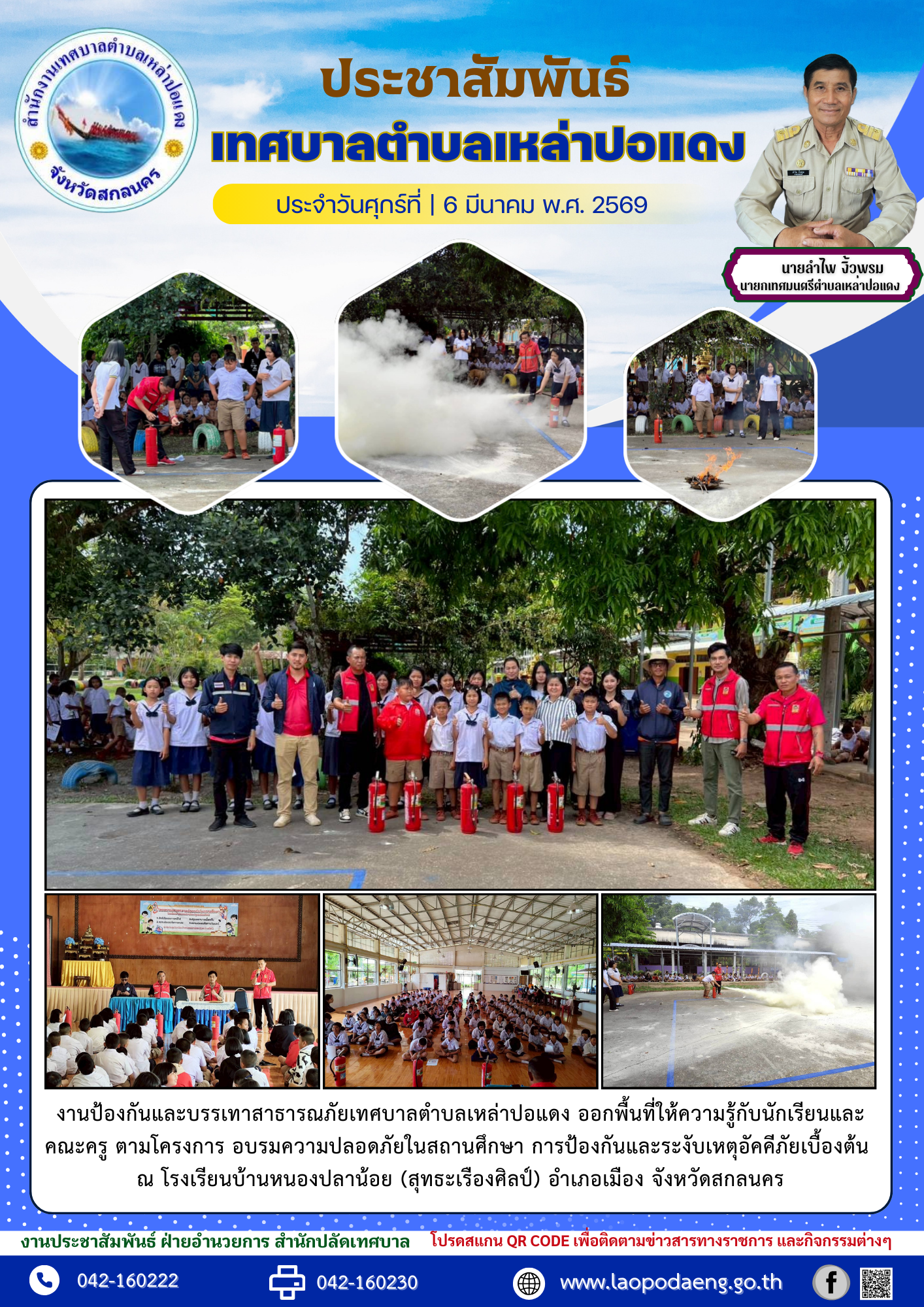 ประชาสัมพันธ์ งานป้องกันและบรรเทาสาธารณภัยเทศบาลตำบลเหล่าปอแดง ออกพื้นที่ให้ความรู้กับนักเรียนและคณะครู ตามโครงการ อบรมความปลอดภัยในสถานศึกษา ณ โรงเรียนบ้านหนองปลาน้อย (สุทธะเรืองศิลป์)