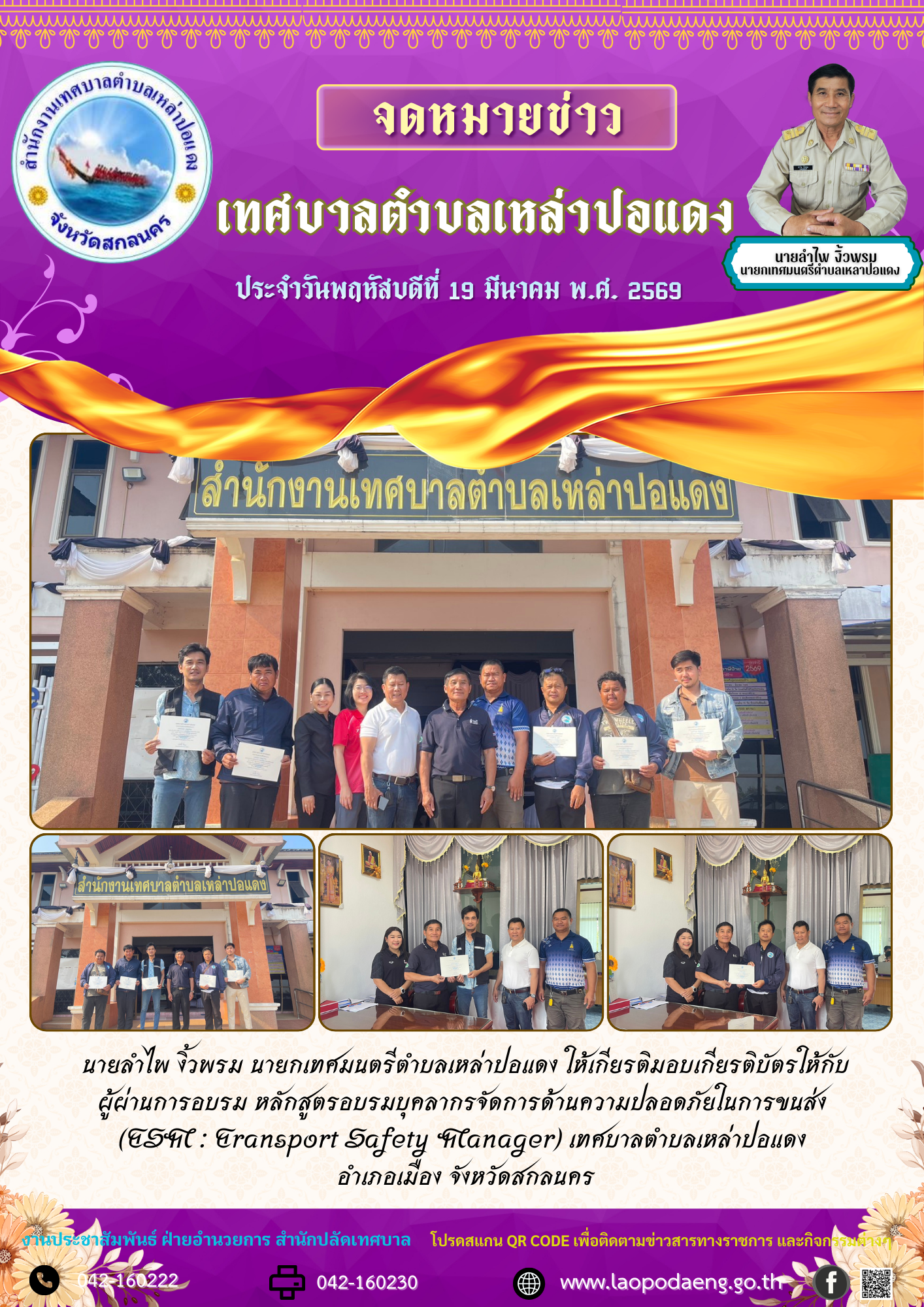 ประชาสัมพันธ์ นายลำไพ งิ้วพรม นายกเทศมนตรีตำบลเหล่าปอแดง มอบเกียรติบัตรให้กับผู้ผ่านการอบรมหลักสูตรอบรมบุคลากรจัดการด้านความปลอดภัยในการขนส่ง เทศบาลตำบลเหล่าปอแดง