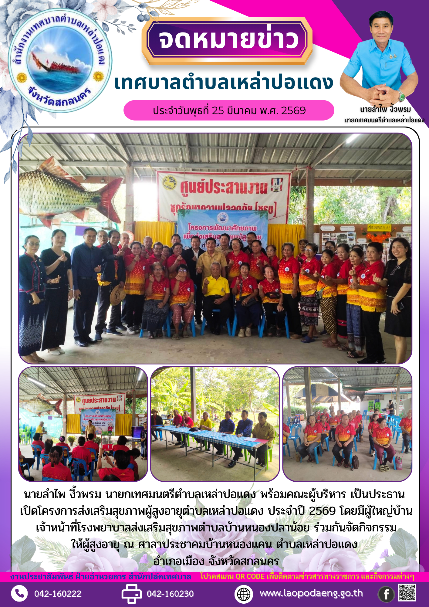 ประชาสัมพันธ์ นายลำไพ งิ้วพรม นายกเทศมนตรีตำบลเหล่าปอแดง เป็นประธาน เปิดโครงการส่งเสริมสุขภาพผู้สูงอายุตำบลเหล่าปอแดง ประจำปี 2569 ณ ศาลาประชาคมบ้านหนองแคน ตำบลเหล่าปอแดง อำเภอเมือง จังหวัดสกลนคร