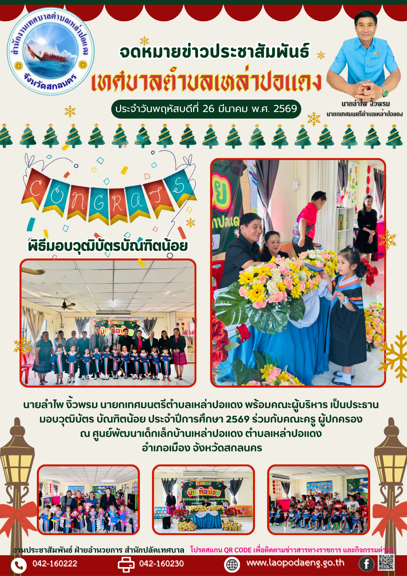 ประชาสัมพันธ์ นายลำไพ งิ้วพรม นายกเทศมนตรีตำบลเหล่าปอแดง เป็นประธาน มอบวุฒิบัตรบัณฑิตน้อย ประจำปีการศึกษา 2569 ณ ศูนย์พัฒนาเด็กเล็กบ้านเหล่าปอแดง ตำบลเหล่าปอแดง อำเภอเมือง จังหวัดสกลนคร