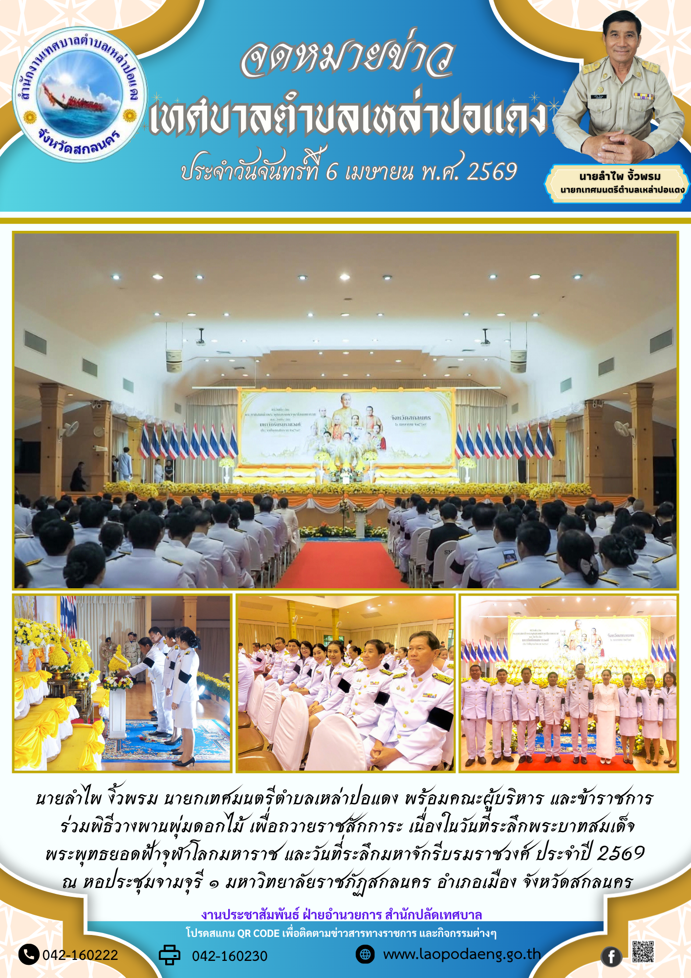 ประชาสัมพันธ์ นายลำไพ งิ้วพรม นายกเทศมนตรีตำบลเหล่าปอแดง ร่วมพิธีวางพานพุ่มดอกไม้ เนื่องในวันที่ระลึกพระบาทสมเด็จพระพุทธยอดฟ้าจุฬาโลกมหาราชและวันที่ระลึกมหาจักรีบรมราชวงศ์ ประจำปี 2569 ณ หอประชุมจามจุรี ๑ มหาวิทยาลัยราชภัฏสกลนคร