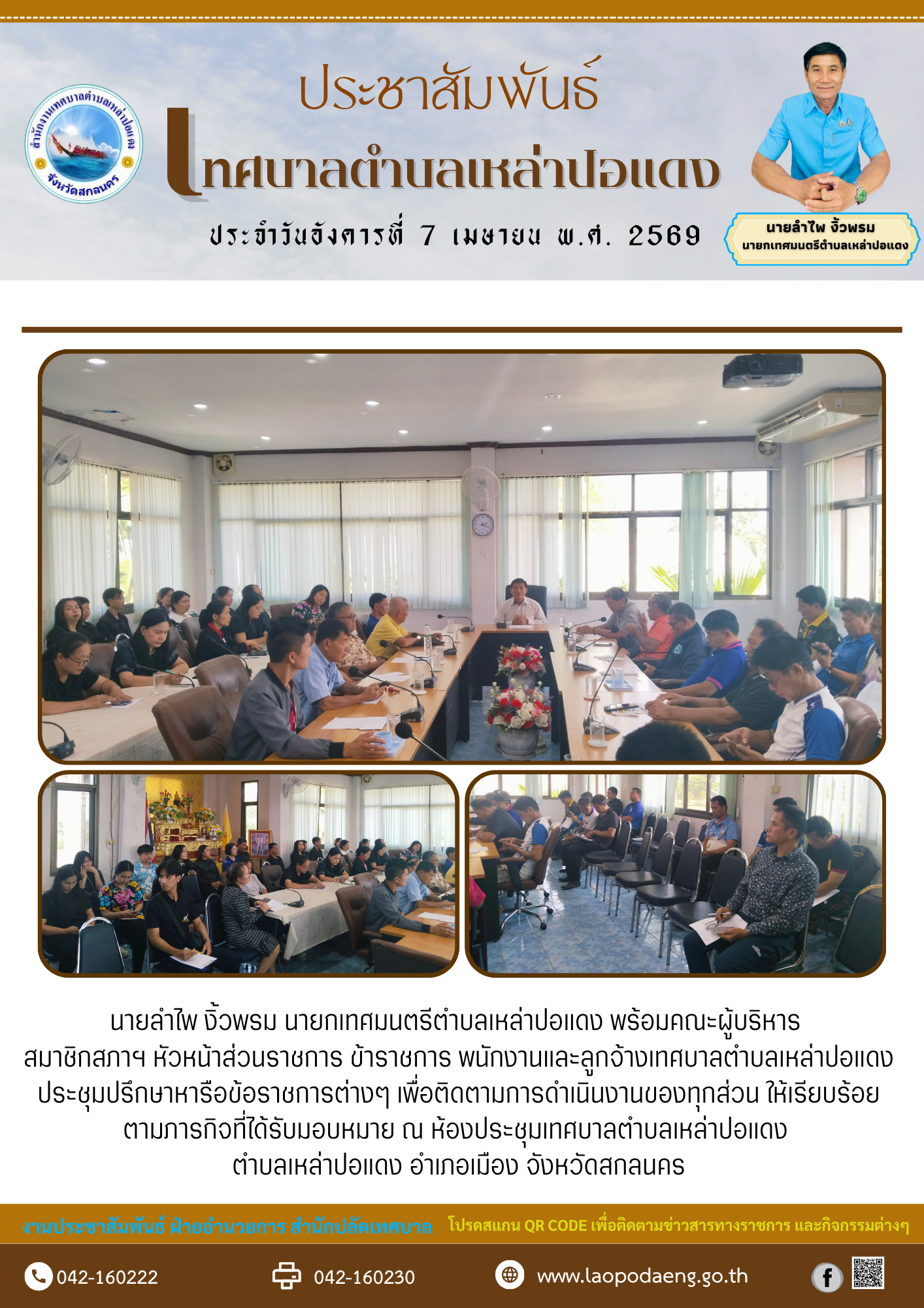 ประชาสัมพันธ์ นายลำไพ งิ้วพรม นายกเทศมนตรีตำบลเหล่าปอแดง พร้อมคณะผู้บริหาร สมาชิกสภาฯ หัวหน้าส่วนราชการ ข้าราชการ พนักงานและลูกจ้างเทศบาลตำบลเหล่าปอแดง ประชุมปรึกษาหารือข้อราชการต่างๆ ณ ห้องประชุมเทศบาลตำบลเหล่าปอแดง ตำบลเหล่าปอแดง อำเภอเมือง จังหวัดสกลนคร