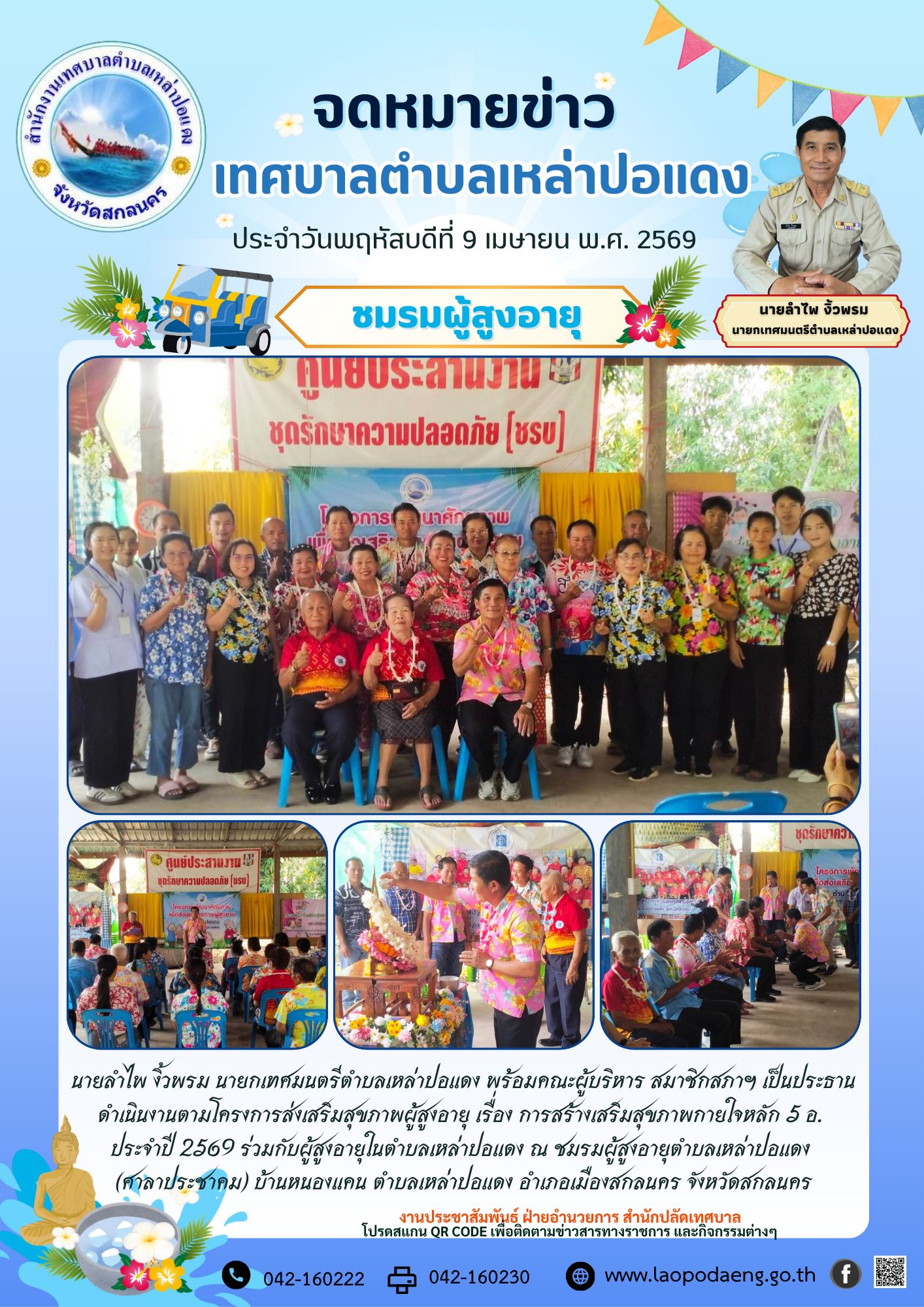 ประชาสัมพันธ์ นายลำไพ งิ้วพรม นายกเทศมนตรีตำบลเหล่าปอแดง พร้อมคณะผู้บริหาร สมาชิกสภาฯ เป็นประธานดำเนินงานตามโครงการส่งเสริมสุขภาพผู้สูงอายุ เรื่อง การสร้างเสริมสุขภาพกายใจหลัก 5 อ. ประจำปี 2569 ณ ศาลาประชาคมบ้านหนองแคน อำเภอเมืองสกลนคร จังหวัดสกลนคร