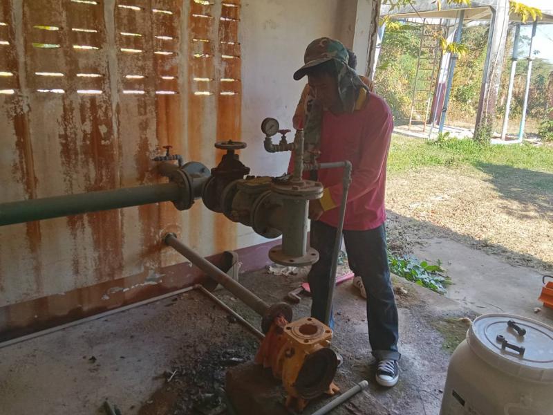 เจ้าหน้าที่กองช่างลงพื้นที่ออกติดตั้งมอเตอร์ระบบน้ำประปา หมู่ที่ 4 บ้านกกส้มโฮง