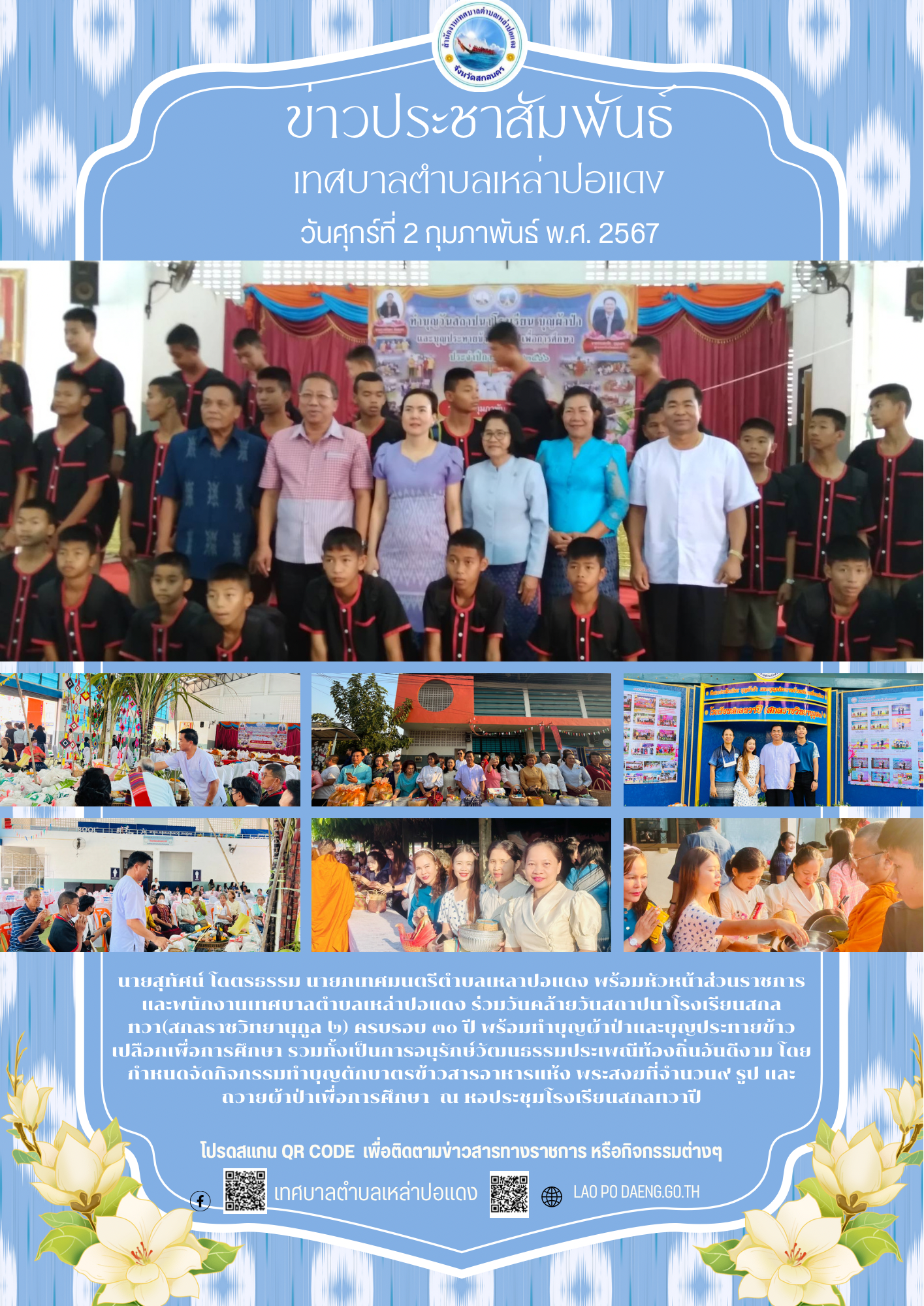 ประชาสัมพันธ์ ทำบุญวันคล้ายวันสถาปนาโรงเรียนสกลทวา(สกลราชวิทยานุกูล ๒) ครบรอบ ๓๐ ปี