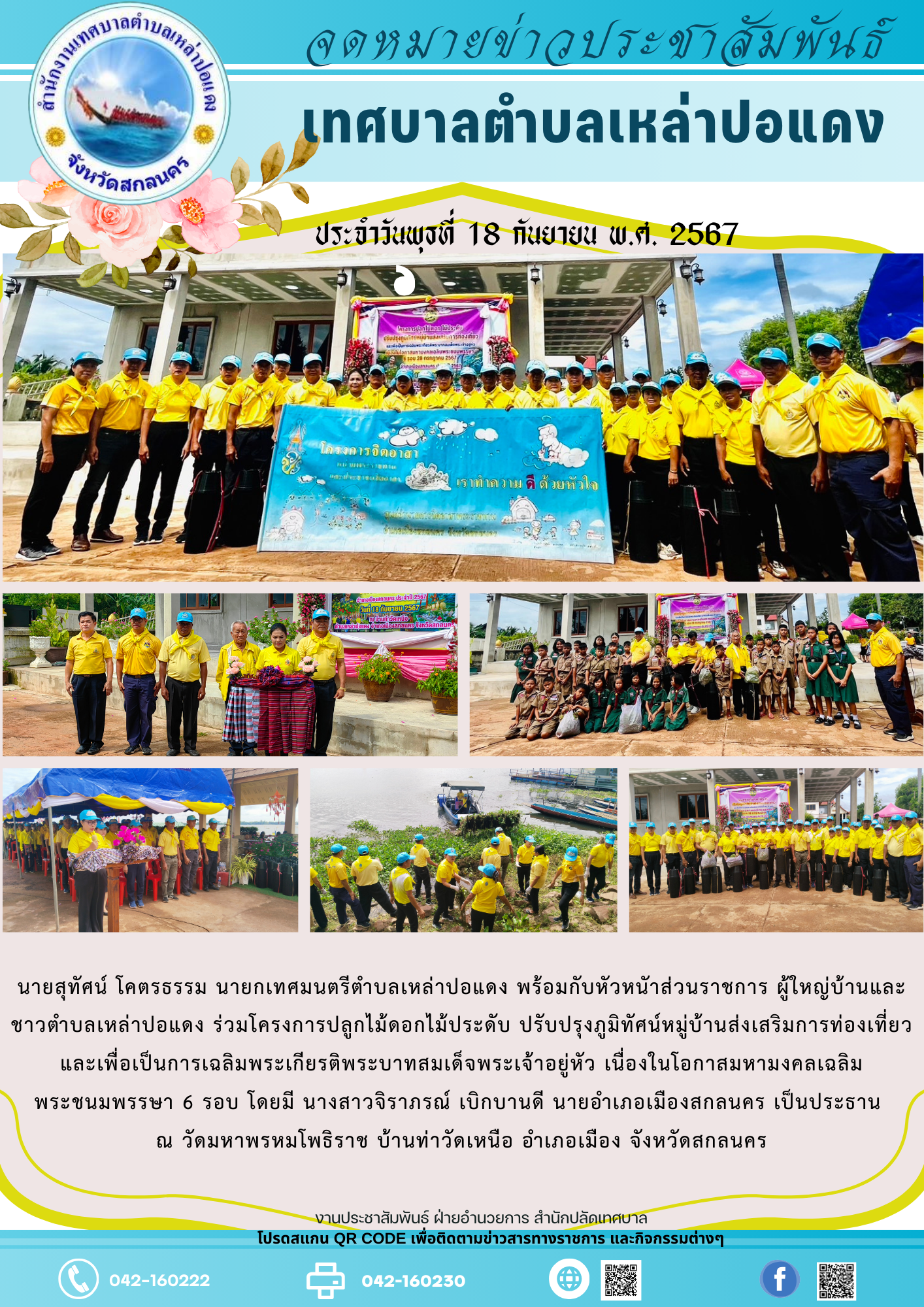 ประชาสัมพันธ์ นายสุทัศน์ โคตรธรรม นายกเทศมนตรีตำบลเหล่าปอแดง ร่วมโครงการปลูกไม้ดอกไม้ประดับ ปรับปรุงภูมิทัศน์หมู่บ้านส่งเสริมการท่องเที่ยว ณ วัดมหาพรหมโพธิราช บ้านท่าวัดเหนือ อำเภอเมือง จังหวัดสกลนคร