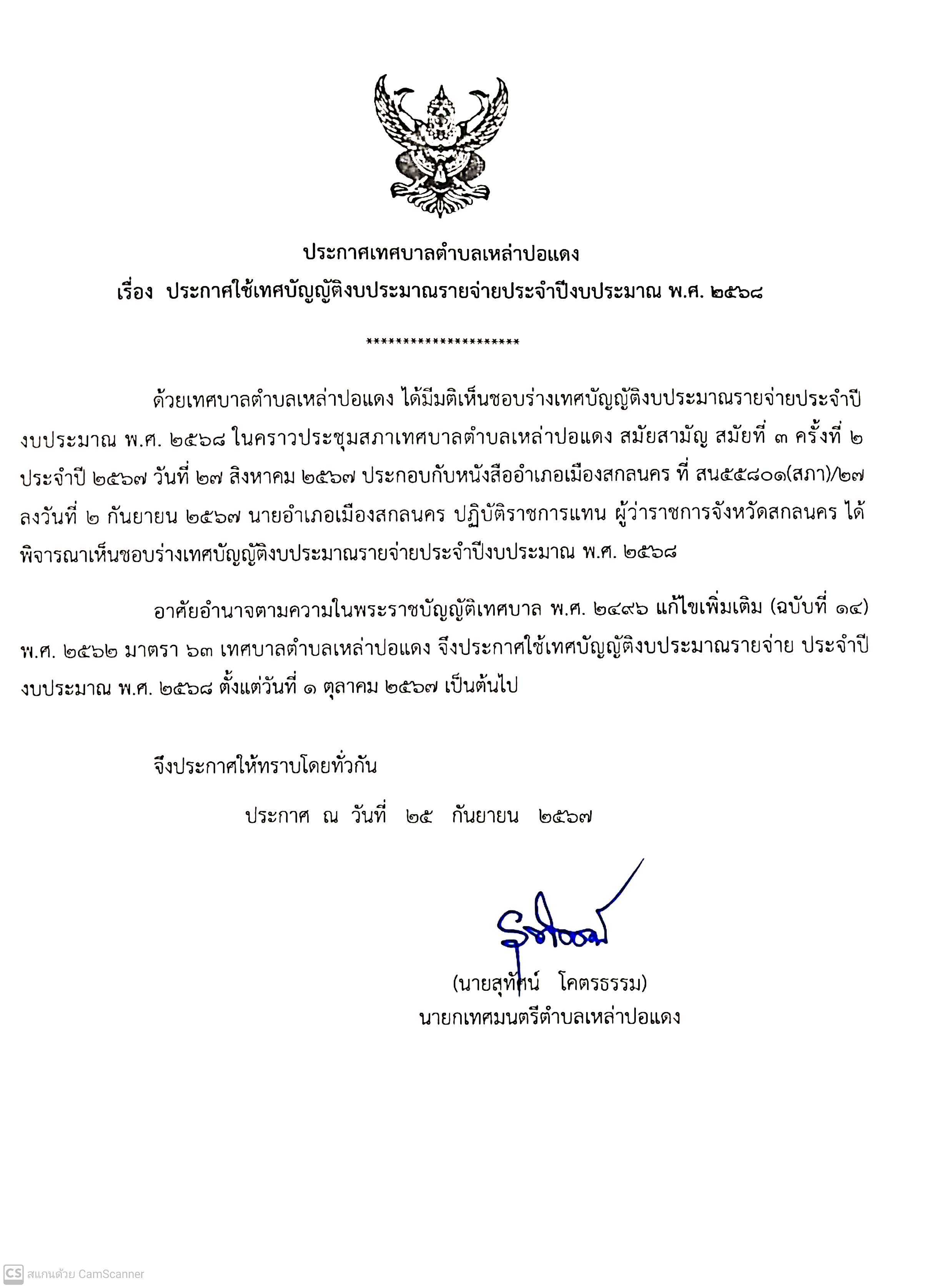 ประกาศเทศบาลตำบลเหล่าปอแดง เรื่อง ประกาศใช้เทศบัญญัติงบประมาณรายจ่ายประจำปีงบประมาณ พ.ศ. 2568